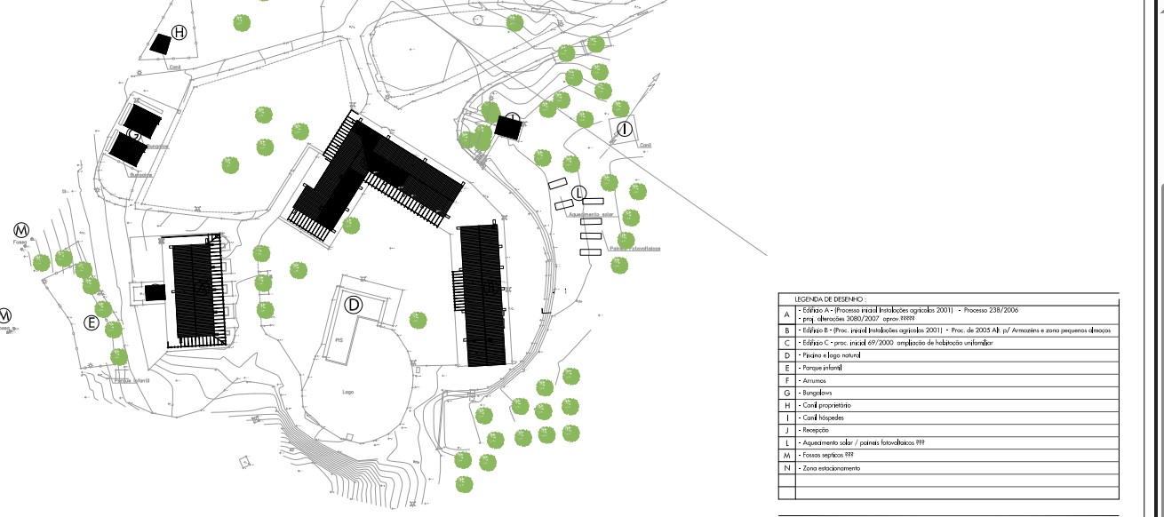 Além disso, a propriedade conta com uma casa principal de 90 m2, piscina, lago, barragem, parque infantil, cafetaria com zona de refeições, lavandaria, alojamento para o pessoal, horta com diversas árvores de fruto, pinheiros, oliveiras, caminhos pedestres, canis, e painéis solares.